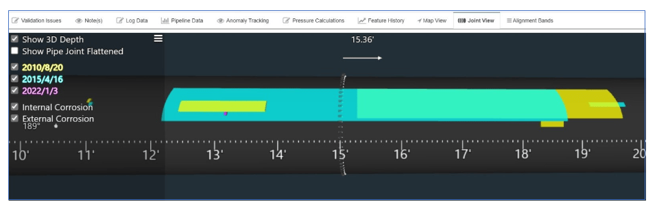 ‘Historical Growth Trend’ calculates a growth rate from 3 or more reported depths by fitting a multi-point trend line through the anomaly depths. This can be quite useful, especially if you suspect anomaly growth was active, but a recent ILI may provide evidence that it has since been rendered inactive.