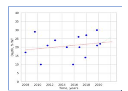 Graph 1: An illustration of the Historical Growth Trend method which calculates the CGR by fitting a multi-point trend line through ILI-predicted depths of one anomaly from multiple ILIs.